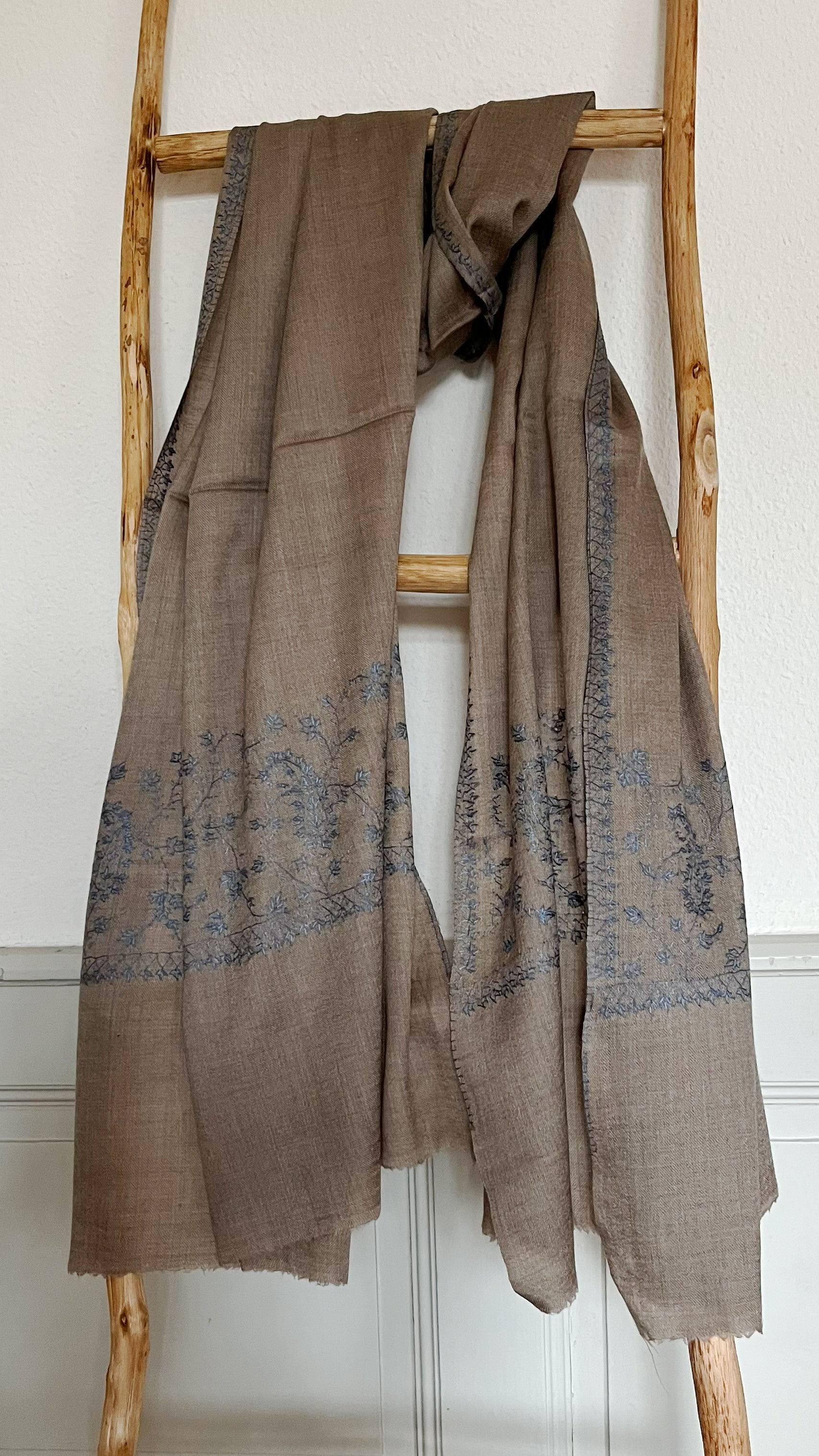 The stole comes in a warm stone colour and is finished with subtle hand-embroidered floral branches in light blue-grey tones. The embroidery is fine and understated, adding quiet detail without drawing attention away from the fabric itself.