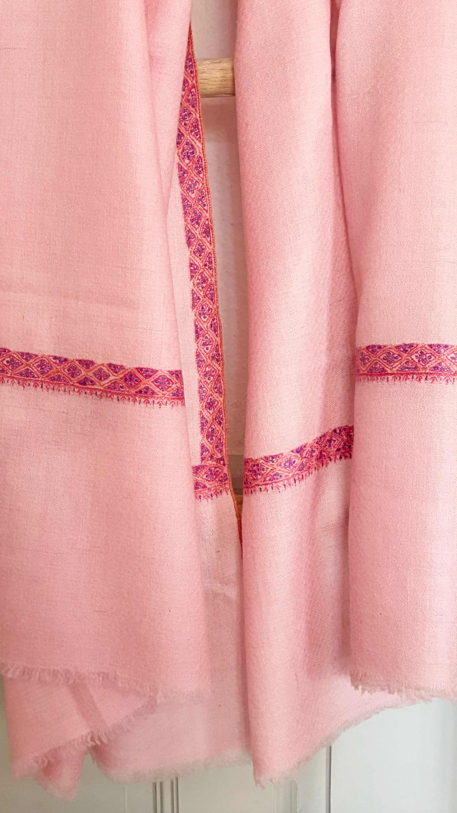 Crafted in the heart of Kashmir, our 100% cashmere Pashmina stole exemplifies artisanal excellence. The pink colour of this stole, complemented by tasteful embroidery in pink and purple colour silk thread, showcases the skill of Srinagar's artisans.