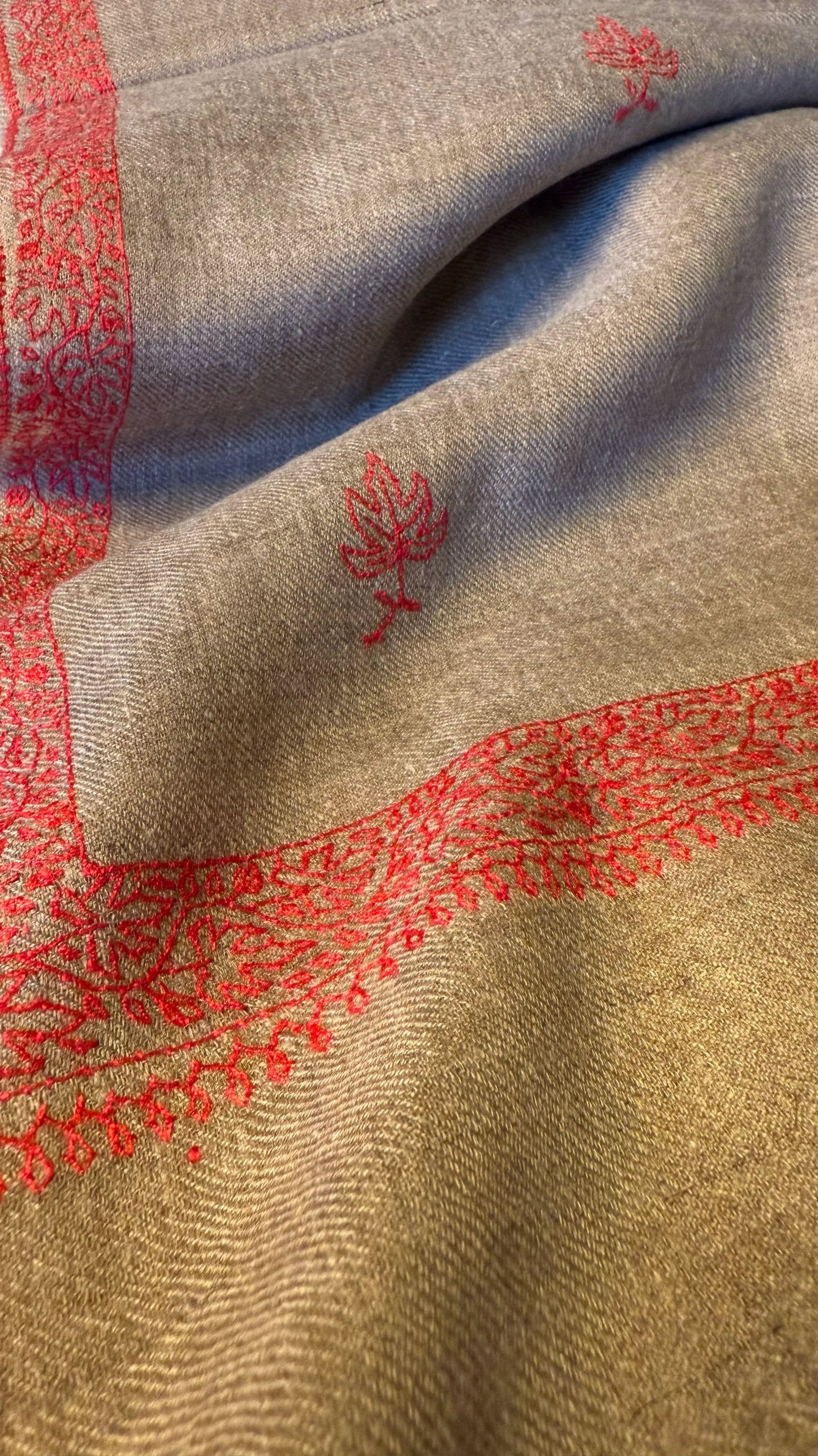This Pashmina Stole measures 70x200 cm and is crafted from 100% pure Pashmina, woven on traditional wooden looms in Srinagar, Kashmir. Skilled women artisans hand-spin it, showcasing the region’s rich Pashmina tradition. The stole has a warm beige background decorated with detailed hand-embroidered pine leaf motifs and a border stitched with red silk thread. The embroidery exemplifies Kashmir’s renowned craftsmanship, blending tradition with elegance. Lightweight and soft, this stole combines practicality with style, providing comfort during cooler days and adding sophistication to any outfit. It signifies authentic Kashmiri artistry, making it a meaningful addition to your wardrobe or a thoughtful gift.